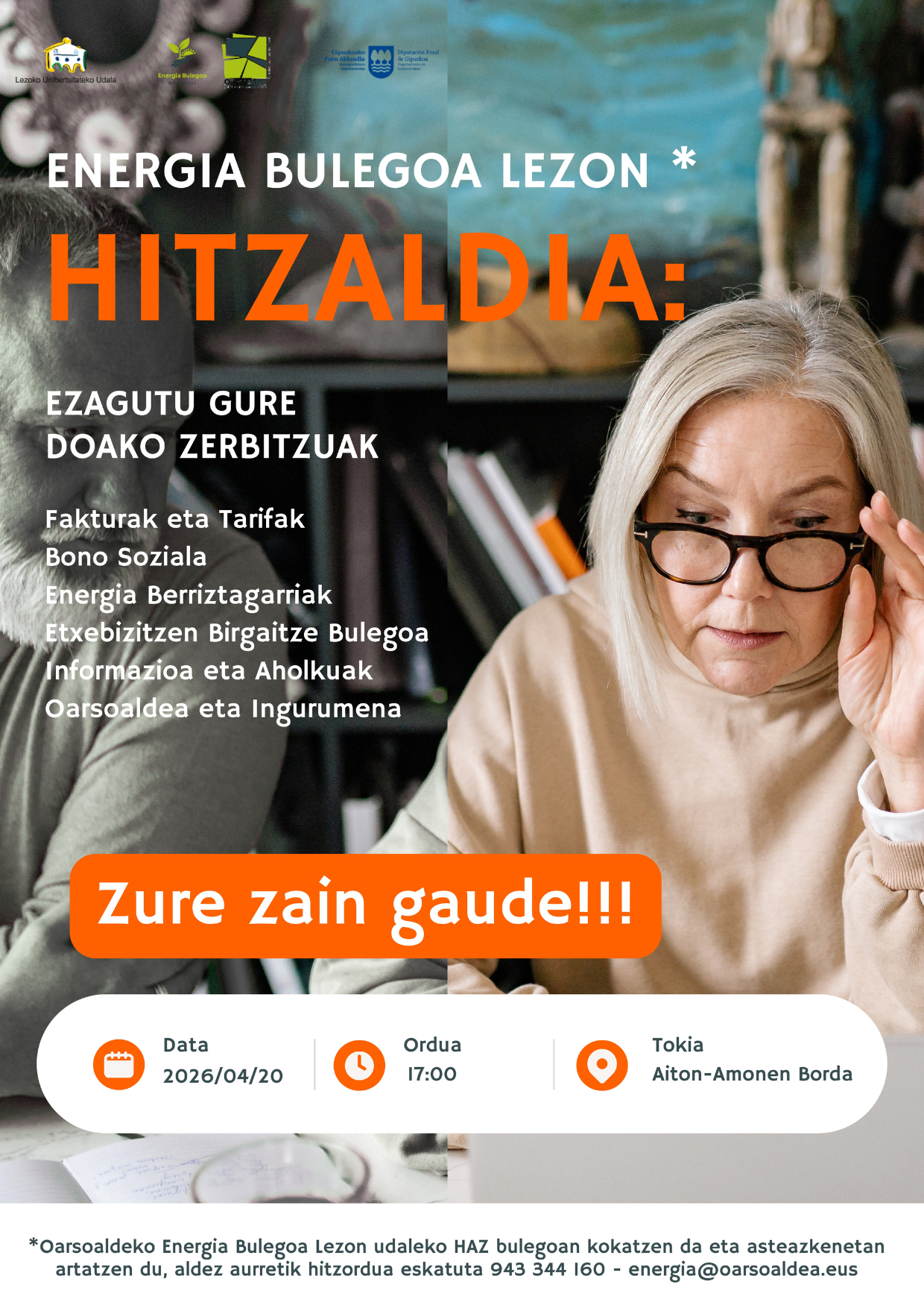 "Zerbitzua Udaleko HAZ bulegoan ematen da asteazkenero 2025eko maiatzetik, aurretiko hitzorduarekin, eta fakturei, tarifei, bonu soziala bezalako laguntzei, energia berriztagarriei, etxebizitzen birgaitzeari eta abarri buruzko aholkularitza pertsonalizatua eskaintzen du. Hitzaldia apirilean izango da Aiton-Amonen Bordan baliabide hauen berri emateko."